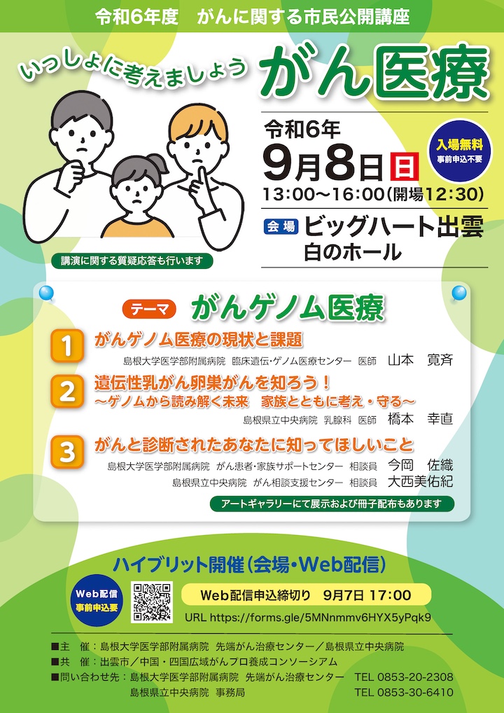 令和6年度 がんに関する市民公開講座 会期 2024年9月8日(日)13:00~16:00(開場12:30) テーマ がんゲノム医療 開催形式 ハイブリッド開催(会場・WEB配信) 場所 ビッグハート出雲 白のホール ※ 今年度の市民公開講座は終了しました。多くのご参加ありがとうございました。 添付ファイル(ダウンロードしてご確認ください) 令和6年度がんに関する市民公開講座