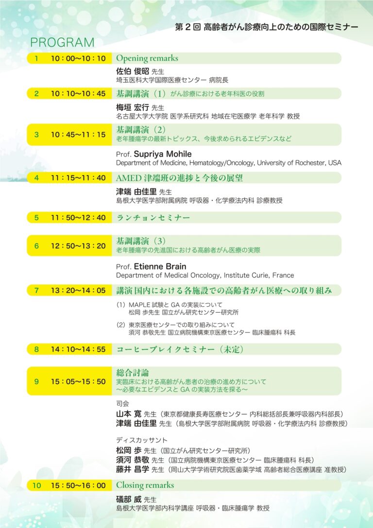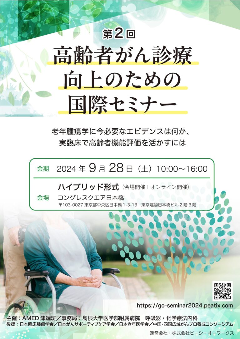 第2回高齢者がん診療向上のための国際セミナー 会期 2024年9月28日(土)10:00~16:00 テーマ 老年腫瘍学に今必要なエビデンスは何か、実臨床で高齢者機能評価を活かすには 開催形式 ハイブリッド開催 場所 コングレスクエア日本橋(東京都中央区)/オンライン(Zoom) ※ 本セミナーは終了しました。多くのご参加ありがとうございました。 添付ファイル(ダウンロードしてご確認ください) 第2回高齢者がん資料向上のための国際セミナー